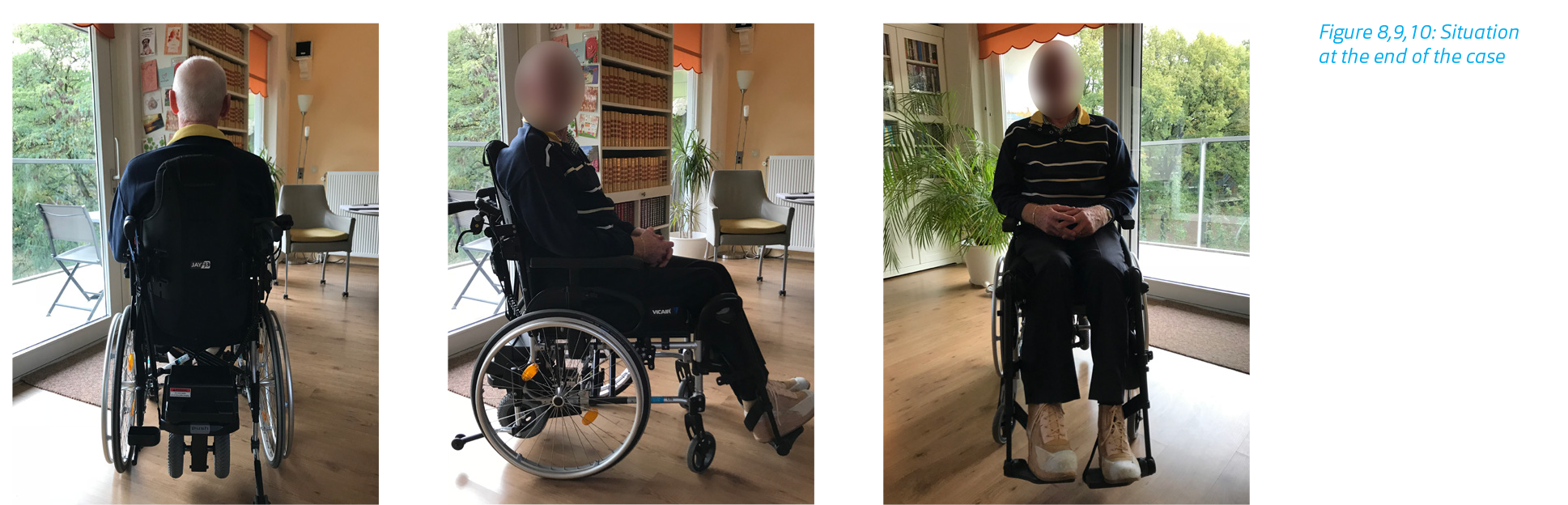 He also immediately indicates that he feels more supported. A longer testing period should point out of the cushion also delivers the desired results for the long term. After about a month of testing, Mr R is still positioned nicely straight in his wheelchair on the adjusted cushion. He, however, indicates that he has a new fitting shoe for his AFO and received new leg support for his wheelchair.