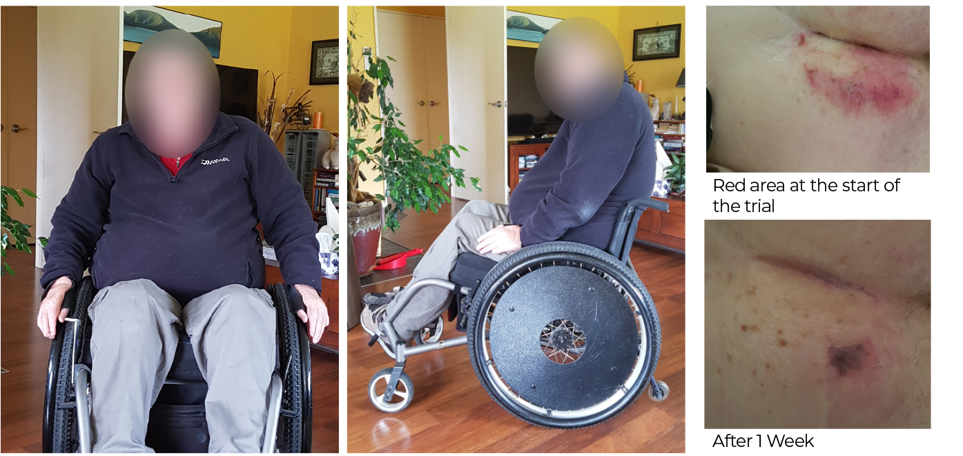 Mr. R has recently developed a red area on his bottom that is not going away. He is getting older and his shoulders are less able to push. Older age also brought along other health issues regarding his kidney function and bowel program. He had spent some time in hospitals and the red area most likely arose from those inpatient stays and a greater amount of passive sitting during that time (whereas he usually moves about a lot in his chair). His occupational therapist wanted to investigate cushions which could provide robust postural support but would be lightweight, easier to maintain and provide the best pressure care.