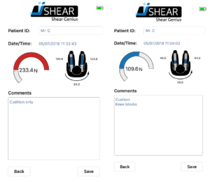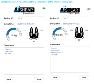iShear shows an off-the-chart measurement of shear forces when Mr C. is positioned in his wheelchair without any aids. When the knee blocks are applied an overall reduction of 7kg in shear forces is observed.