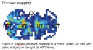 First, the pressure under the left IT is compared to the pressure under the right IT. For the Vicair Vector O2, the pressure under the right IT is 134mmHg with a pelvic obliquity of 2cm to the right, while the measured pressure under the left IT is 117mmHg. This represents a pressure difference of 15%. A large pressure difference indicates a higher risk of problems at the lowest lying bony points.