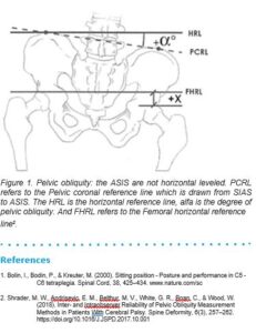 Pelvic obliquity (PO) is an orthopaedic condition, it is the misalignment of the pelvis, typically one hip is higher than the other. Or in more medical terms it is defined by a spinopelvic asymmetry in the frontal plane, the Anterior Superior Iliac Spine (ASIS) are not horizontally levelled. In a survey under a Dutch group of wheelchair users the self-reported prevalence of PO is 58%, the PO ranges from 2-4cm (4.5-9.1°).