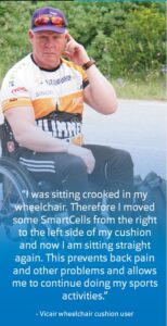 PO can be categorized as functional/flexible, this means that the PO can be corrected, or as structural/fixed. A structural PO cannot be corrected, only accommodated. But in real life it is often a combination of both, partly functional & partly structural. Scoliosis, which is a sideways curve of the spine, can be either a cause or a consequence of PO. Other consequences of pelvic obliquity are pain, lack of postural stability and pressure injuries. Therefore it’s important to recognise PO and correct or accommodate PO with a suitable wheelchair cushion or other wheelchair set-ups.