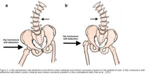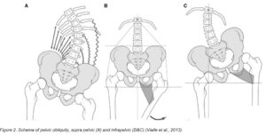 Vialle et al. had an explanatory figure in their article ‘neuromuscular scoliosis’. The figure shows that if pelvic obliquity results from a pre-existing scoliosis the muscles connecting the trunk and pelvis can asymmetrically retract (fig A). Figure B and C show that hip posture asymmetry causes retraction, usually in adduction, flexion and internal rotation, predominating on one hip; this asymmetry of retraction induces pelvic malpositioning (Vialle et al., 2013).