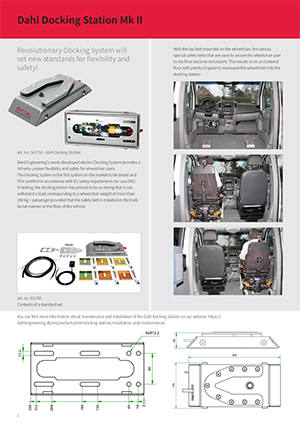The Dahl wheelchair docking system is a safe way to quickly and independently (for some users) secure a power wheelchair in a vehicle. A plate attached to the underside of the powerchair slides into the Docking System which is mounted to the floor of the vehicle. The shape of the plate ensures easier docking as it guides the chair into a secure and stable position.