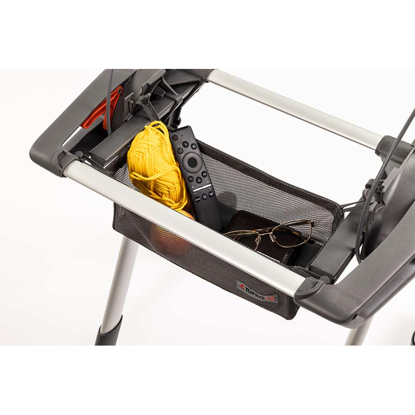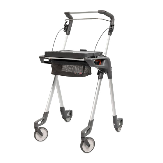 The walker is equipped with a multitude of intelligent functions that allow for safer mobility, support in sit to stand, and safe transport of meals and other items.