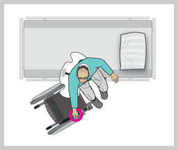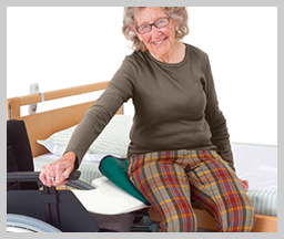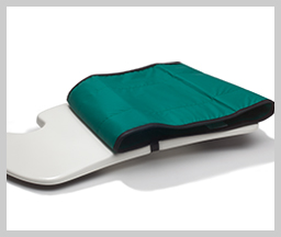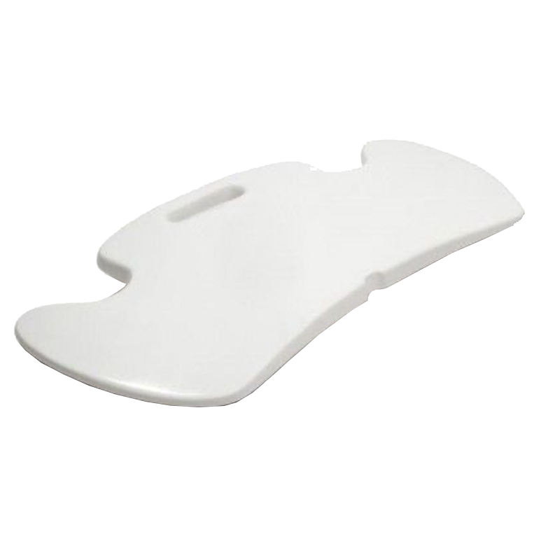 This transfer board has cut outs for positioning against the wheel of a wheelchair.