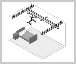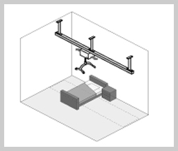 The ceiling track hoist H system covers the entire room. This enables lifting regardless of where the furniture and the patient are located in the room.