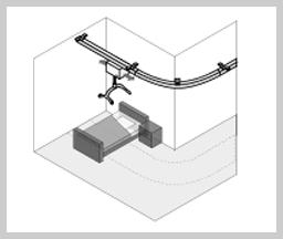 Extends the area for transfer and will allow the ceiling lift track system to pass through one or more rooms. A switch can be added to cover more pick up points. This will enable transfer from bed to chair, toilet, shower or bath.