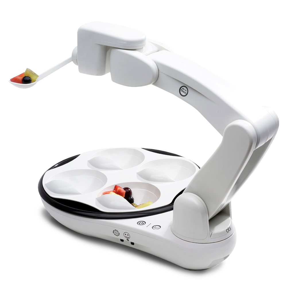 - With the touch of a switch, Obi allows users to select between four compartments of food and to command when the food is delivered to their mouth.