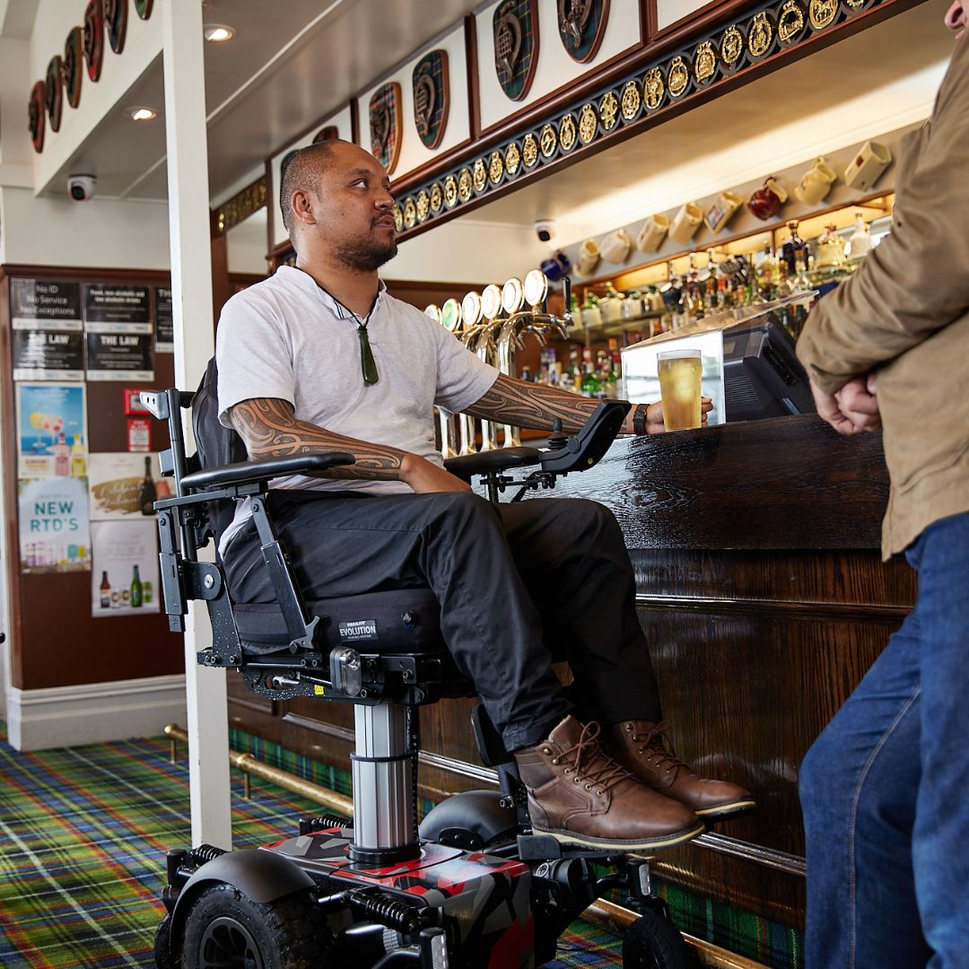 The TA LC power function lowers the seat plate to a minimum height of only 15″, allowing you to sit under tables and desks. It is the lowest powered-wheelchair on the market.