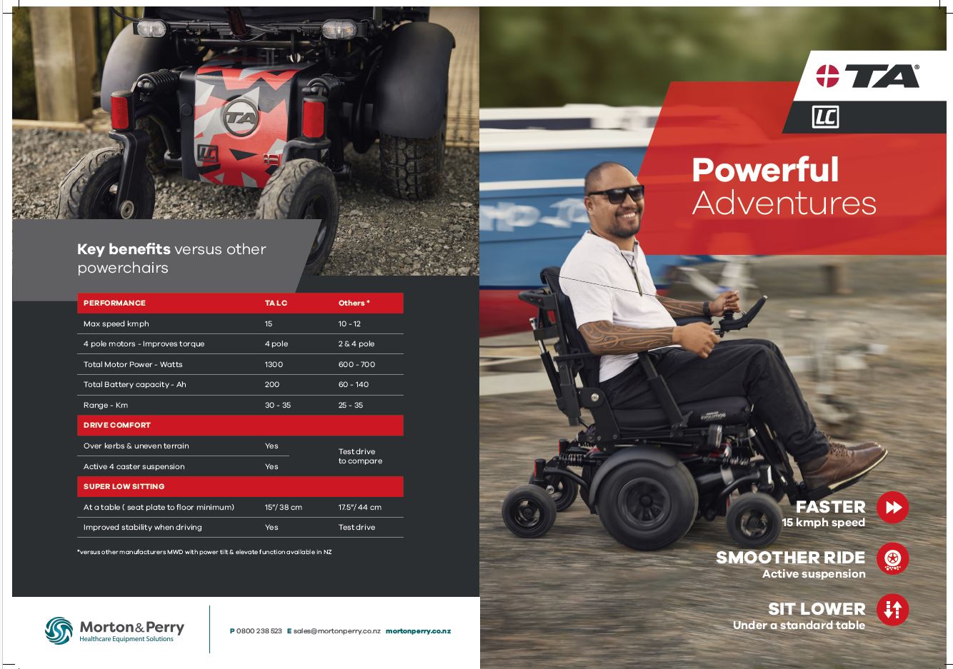 - Like our TA RS Powered Wheelchair, the TA LC sits lower than any other model available, facilitating easy navigation under standard tables and desks, and enhancing accessibility in various environments.