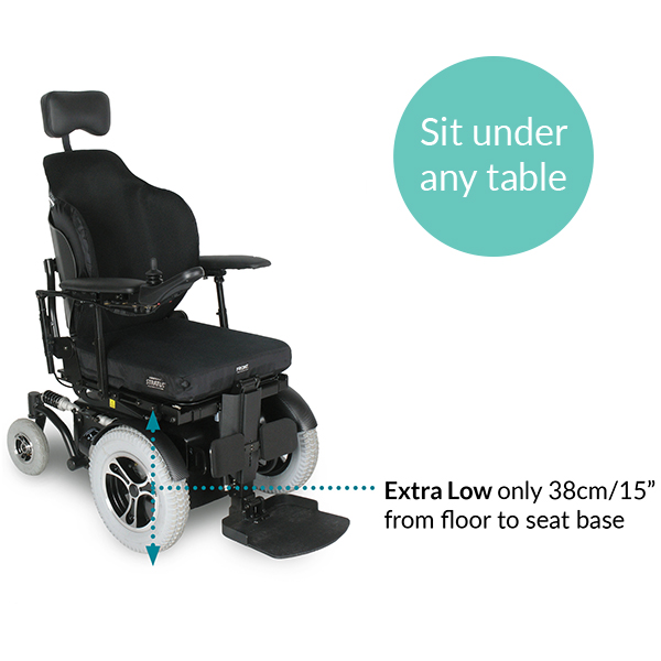 The telescopic HiLo function can lower your wheelchair seat to a height of 38cm (excluding cushion) allowing you to sit under tables and desks.