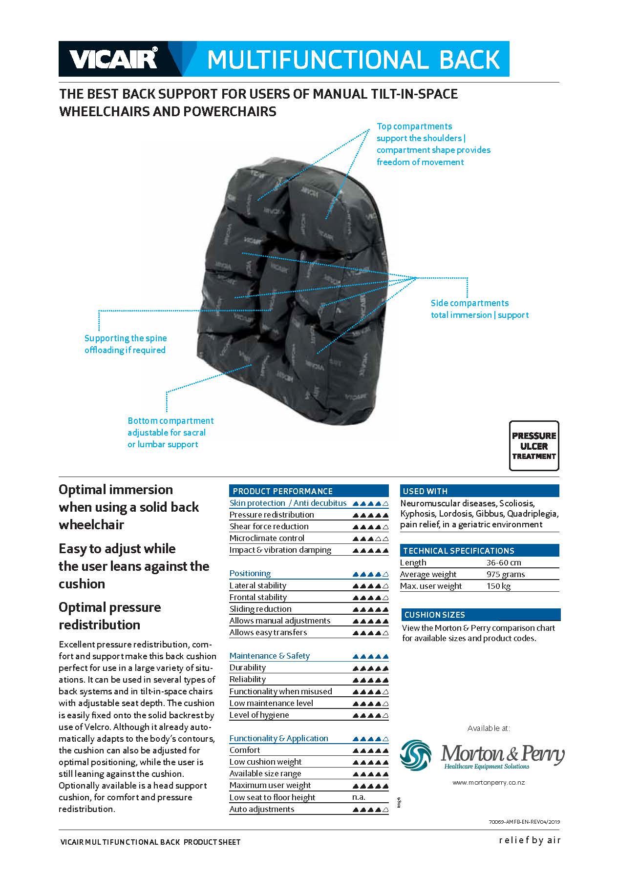 The Vicair Multifunctional back is a wheelchair back cushion that helps prevent pressure injuries. It is also a high-quality addition to a pressure ulcer treatment plan (stage I-IV).