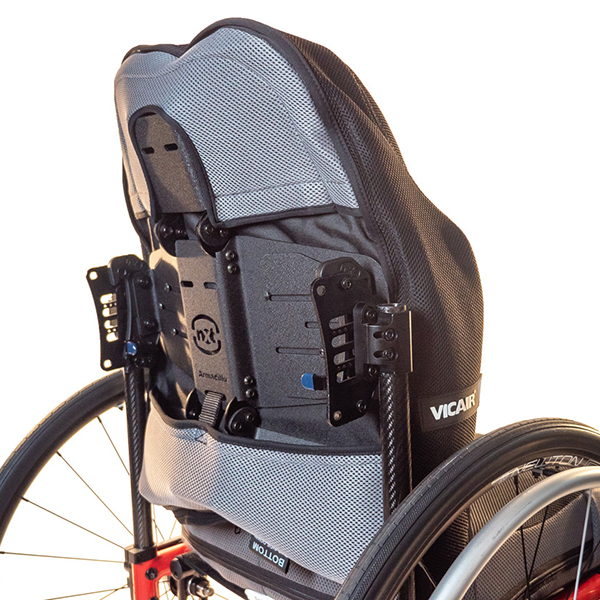 This Armadillo adjustable backrest features a three-section modular shell. Designed to fit the unique contour of the user’s spine and to accommodate users with: Kyphosis, Lordosis, Scoliosis, rotational asymmetry and other spinal deformities. For ultimate pressure care Nxt teamed up with Vicair to combine the Armadillo with a Vicair back cushion consisting of multiple pockets containing SmartCells. The pockets AirCell content can be adjusted to suit the shape of the back. The central recessed pockets are designed for offloading spine pressure zones.
