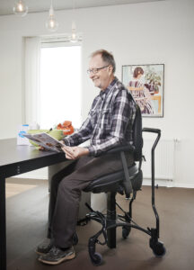 It not only relieves his wife but also provides beneficial exercise for Kaj Henning. The VELA chair assists him in areas where he is weakest, eliminating his fear of the consequences of his physical limitations. For instance, it compensates for Kaj Henning’s reduced leg muscle strength and lack of balance. Consequently, he can now work at the kitchen table and cabinets at a higher level, as well as perform tasks closer to the floor, such as emptying and loading the dishwasher.
